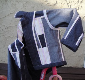 worked very nicely, and there’s only one seam I proceeded to fold and topstitch the wrong way (can you spot it?). I like the touch of colour and pattern inside, and on the under-collar (I should probably have interfaced the undercollar, too, rather than just adding a second layer of the seersucker. I am reasonably confident that my seven-year-old will not give a crap at all about my various booboos.
