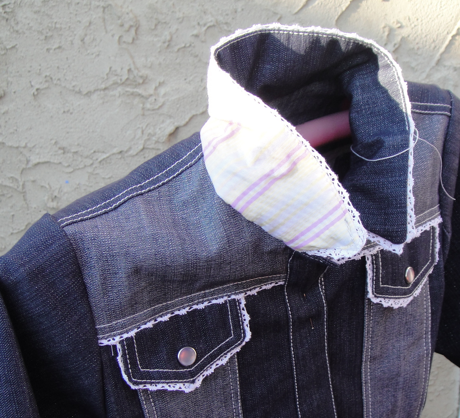 Ok, let’s look at the positives. The lace worked out surprisingly well. I might have used a bit more, but I ran out (seriously, I bought two metres. Who could imagine a jean-jacket could use up two metres of lace??). The pearl snaps are very cute, and much easier to put in now I have the proper tools. The topstitching is relatively flawless. The wider bias-binding inside