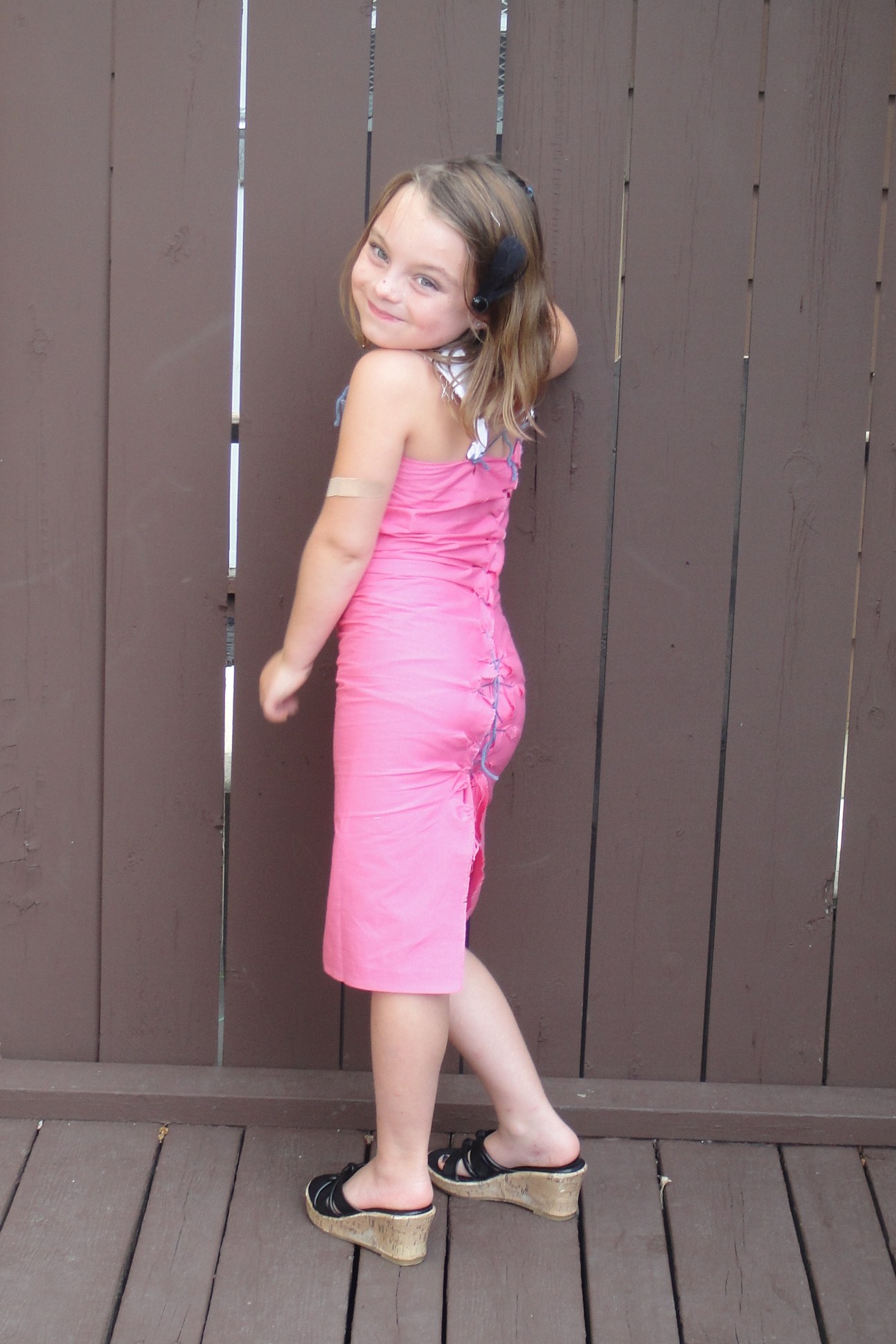 My daughters, on the other hand (aside from passing through the house like a high-pitched whirlwind), did a lot of sewing. In particular, my oldest spent several hours sewing the younger one into a variety of costumes. Ok, perhaps sewing is a bit of a misnomer. There was a bit of lacing
