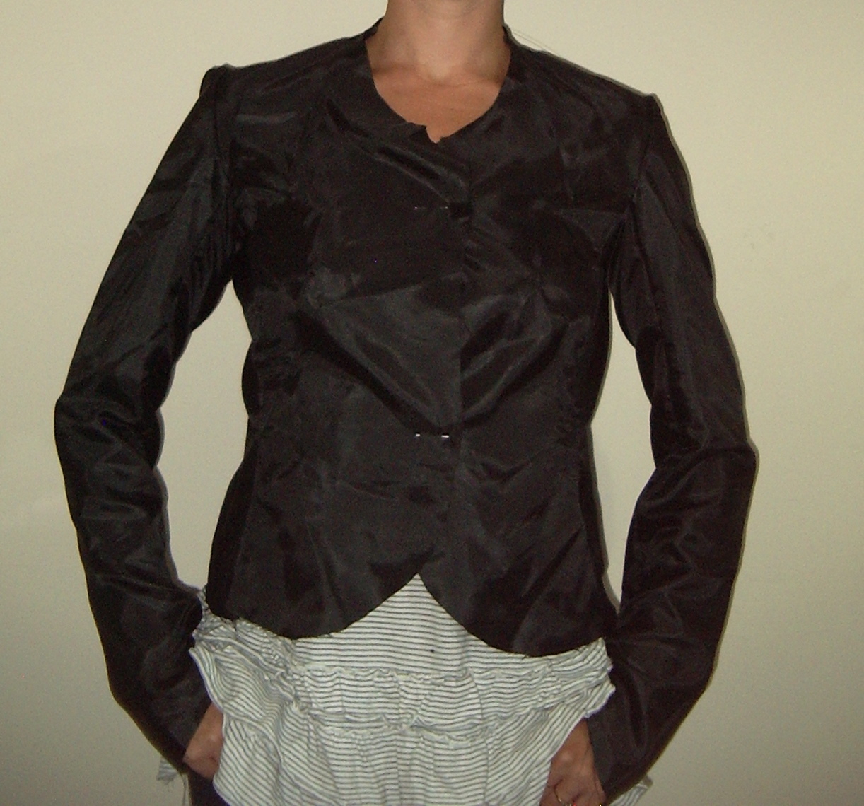 I cut out the lining first and sewed it up quickly to test the fit. The bodice was surprisingly good, although I’m not quite sure there’s going to be enough overlap in the front. Odd, since that should be the one dimension it actually fits me in. Here’s a few shots of it, though they’re mostly terrible. The darts actually fall in a really good place for me (which never happens). The bodice length is awesome (Ok, an extra half-inch somewhere probably wouldn’t’ve hurt, but I like a short jacket so I’m not going to bother). The fit at the curve of my (sway) back is great, too.