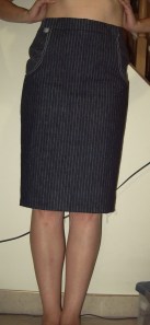 Funny how your feelings about how you look can be so disconnected from how you actually look, hey? Looking at the pictures, I actually don’t mind the skirt. There’s even some curviness at the hip there (aside from the poufy part) that is the main draw of a pencil skirt; though not seeing my bellybutton above a waistband is very disorienting. Wearing it, I feel big as a house. Pregnant. Like I’m driving a minivan. (Yes, driving minivans makes me feel fat. Something about the way they maneuver…)