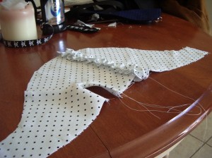 A ruffle-less JJ? Seriously, how much fun is that? I have one already, thanks. So I scrounged through my scraps and managed to produce a few narrow strips suitable for producing minute ruffles, but nowhere near enough for the front.