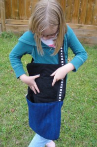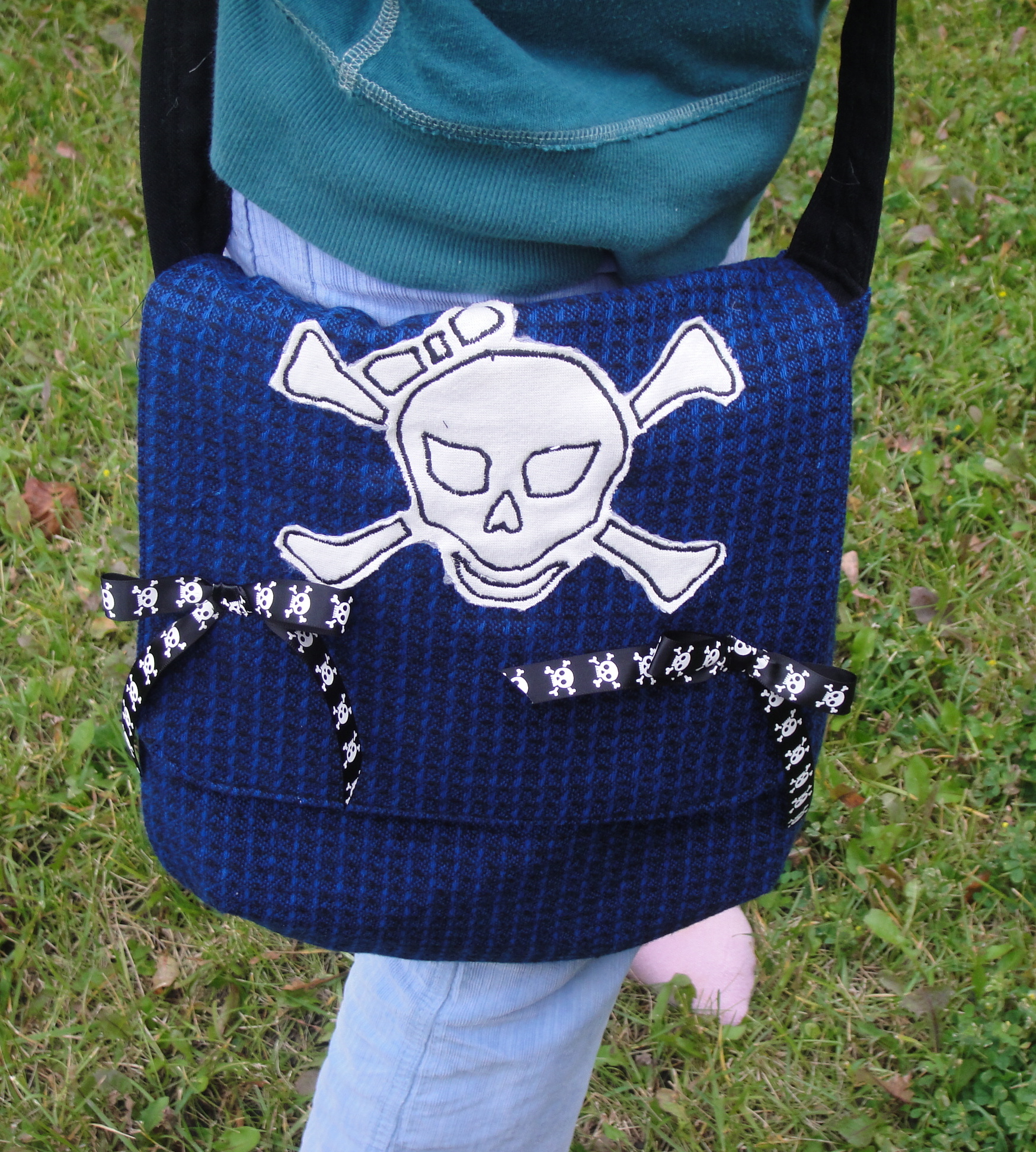 I wouldn’t really call it an independent sewing project—I did the darts in the bag, theapplique skull, and sewed the ribbon on the strap, but she did most of the rest, including turning the strap. Probably she could’ve done more if I could bear to be a bit more hands-off, but I have issues that way. It’s not good, I know.