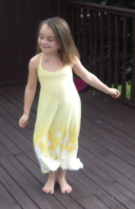 Back around my birthday, when I was feeling splurgy, I let Syo pick out a metre of fabric from the bargain section at Fabricland. She chose a soft, super-stretchy, lycra-y border-print in yellow stripes trimmed in flowers. We got home, and she picked out a pattern, New Look 6195, a kids’ sundress Ip icked up at Value Village. I settled down and traced out a size 7 (length 8)… and there the project sat, although the fabric got plenty of use as a blanket, veil, fairy wings, shawl, cloak, cocoon, and pretty much anything else a creative seven-year-old could do with it.