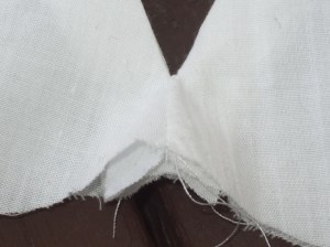 My one (attempt) at innovation this time—I attached the bust pieces at the centre front along a short seam. I’m hoping this will give just enough room to allow me to sew the skirt to the top portion in a circle and enclose the whole seam, giving a nicer finish to the inside (like the inside of a collar). Typicaly this would be topstitched or stitched in the ditch, but I’m not great at that finish in these situations, so I may end up doing it by hand. We’ll see. Here’s a closeup of my attachment:
