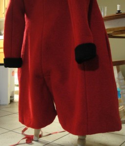The only bit I’m really not happy with (other than the sleeves still being uncomfortably tight) is the rear vent. I used the Cupcake Goddess’s instructions and while the basic principal is sound, I can’t figure out how to do it without creating and offset in the lining so you have a seam allowance (or making the cut-out side shorter). This, added to the difference in the length of the lining vs. the length of the back, meant that my vent-extensions lined up really poorly, and while they lie flat when worn, the lining is a bit short and makes the coat hike up if anything goes off of plum. Also the whole thing requires a degree of precision I find difficult to achieve at the best of times, much less when wrestling five pounds of wool coat around my sewing machine.