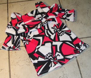 “tunneling”? My usual trick of ironing wash-away stabilizer into the hem before sewing failed because the stabilizer would not stick to this slippery swimsuit-feeling fabric. To make matters worse, the serged edge I put on the bottom of the shirt (to neaten the inside of the hem) kept squishing up between the two needles, making the tunneling between them even worse. And while this wasn’t the wiggliest knit I’ve ever worked with, it is the wiggliest slippery knit. So don’t look too close at the hems… it ain’t pretty.