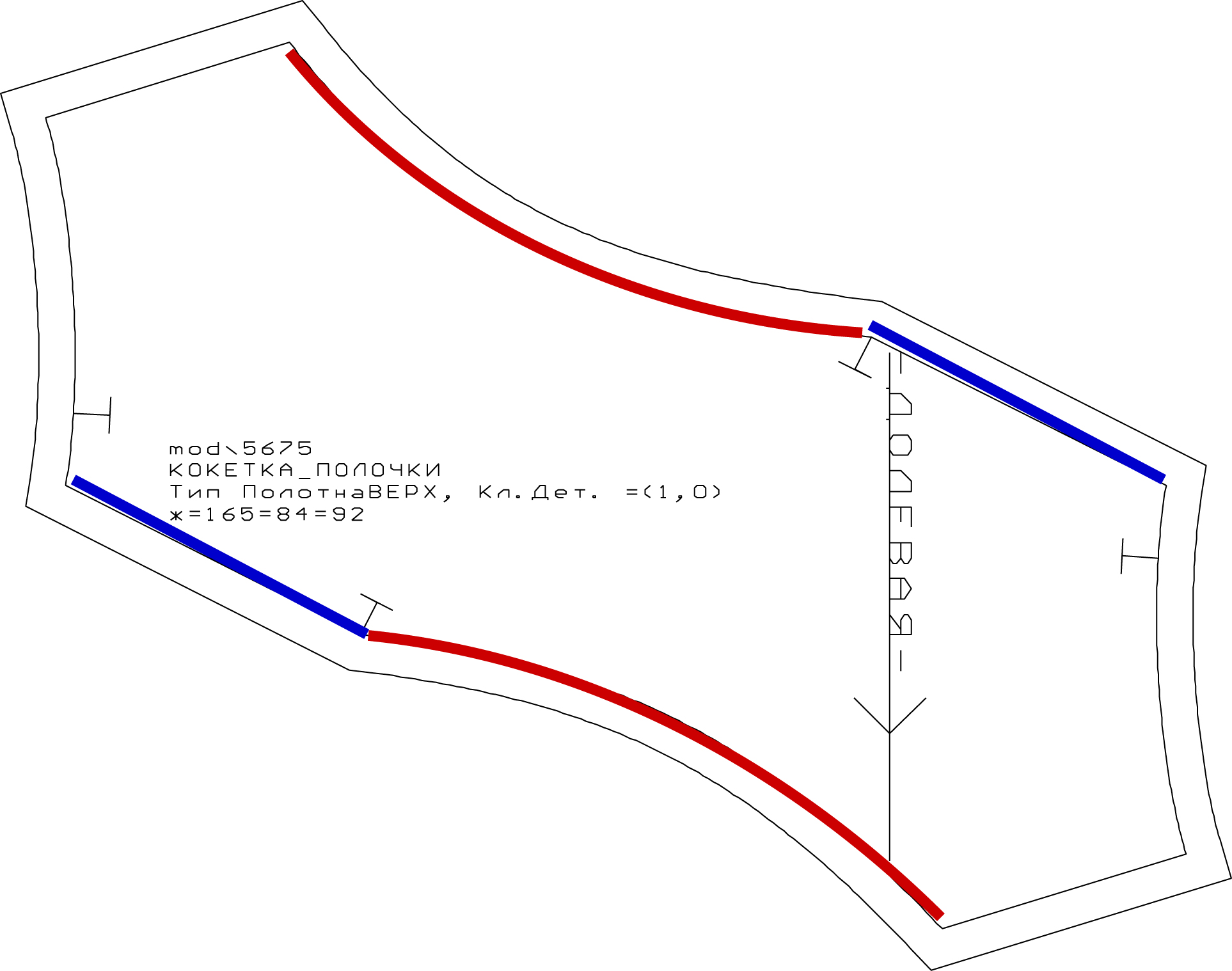wanted to finish the front; I double-layered it to simplify the finishing. If you look at the picture of the pattern piece, I sewed the two layers of the piece together along the red lines; I did the same with the middle portion of the lower bodice. Then I sewed the blue lines to the outer portions of the top of the lower bodice, so that all the seams are enclosed. Despite my best efforts (and liberal use of clear elastic) it wound up quite stretched out, but that reflects on my fabric choice rather than the pattern, I think. I had to turn the bottom of the peekaboo-opening under and tack it on the inside, creating a bit of a “U”, because it was stretched out too badly. It looks okay, but not ideal.