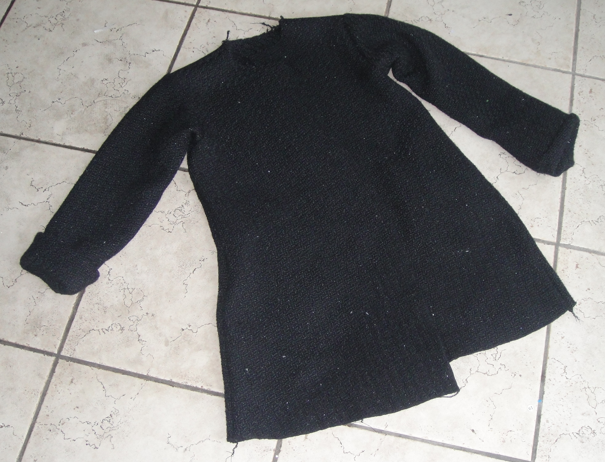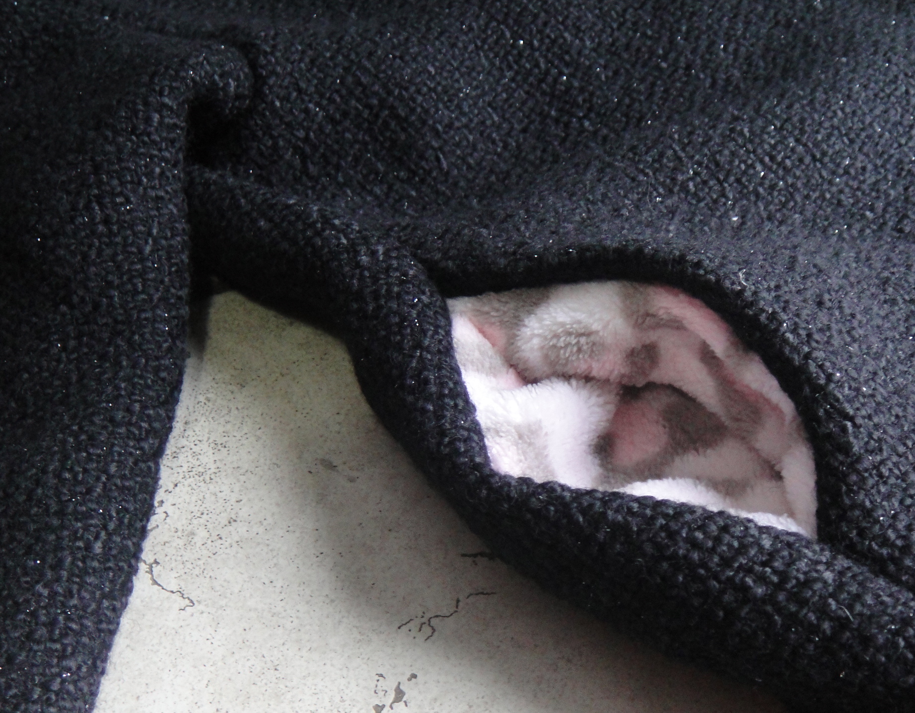 has a lot of fun-fur, fleece, and animal print. Despite the above rant about fleece, the fleece is strictly for the lining. My outer shell is black and sparkly “boiled wool camry blend” (a completely different fabric, however, than the stuff of the same name that the Russian Princess coat and my Czarina coat were made of. They were a knit, dense and felted. This stuff is a woven, tends to fray, and reminds me of boucle in its thick individual yarns.) It would’ve benefited from block fusing, but I am far too lazy to go there in coats for preschoolers. I did preshrink with wet towels in the dryer, which reduced the width by a good 10cm (4″) so I’m glad I did.