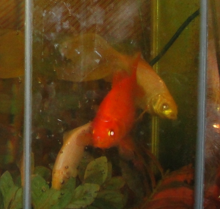 In sadder news, we got up this morning and discovered One-Eyed Jack, the smallest and hardiest of our goldfish, was missing from the tank. I soon found him on the floor by the couch, where he had leapt to his doom. The smallest of our fish, he was still a good 6″ long, and had survived the Great Filter Malfunction of 2009, a 600-km migration in a glass jar in 2007, and a brutal cichlid attack that cost him his left eye (and gave him his name) probably sometime in 2006. Not to mention nearly four years of my rather indifferent fish care. I honestly thought he would be the last of our dwindling fish to survive, but I hadn’t counted on his adventurous nature. Usually he was a bottom-hugger, as his one-eyed state made it hard for him to find food until it had settled on the bottom. Tyo was stoic (her best friend’s dog died of an accident on the weekend, so compared to that the loss of a fish may be minor), Syo was stricken and still crying when I put her on the school bus, and I was a lot more freaked out than I should’ve been. Jack is now in a box in a freezer to await burial in the spring. He’s too special to just chuck in the garbage like the other goldfish we’ve lost.