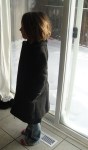 So here it is, sans lining hem and buttons. With the puffy fleece lining it’s a bit snug on Syo, which is a good sign, although the sleeves, which I folded up a trifle more than strictly suggested by the pattern, are just right, so they will be quite long on Fyon.