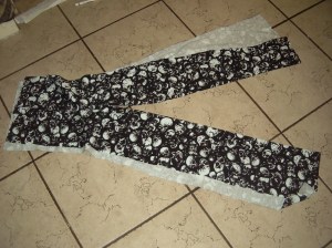 Just to keep me on my toes, though, Tyo decided to pull out the skull-print knit she picked out back in the fall. Apparently it needs to become a set of lounge pants. Unfortunately, I haven’t got a pattern for these. Well, how hard can it be to make one up? Just a narrow set of pantaloons, really, right? In a knit, no less.