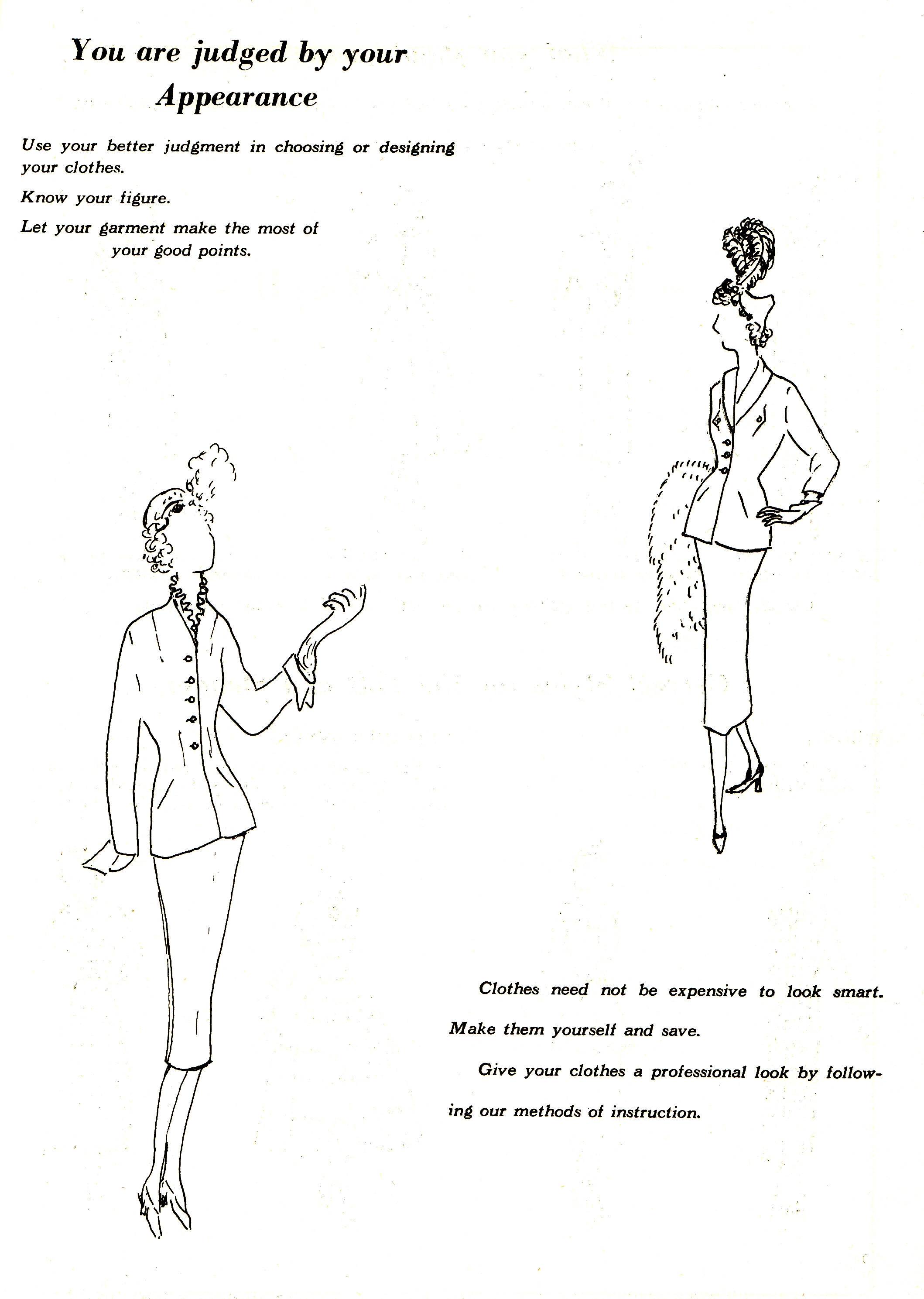 Topics include fabric and style info (including non-washing-machine methods for pre-shrinking fabrics… apparently only linens and white cottons should be boiled; other cottons should be soaked in warm water, not wrung out, and hung to dry still folded). There’s an extensive section on fit (actually, about four separate sections… the layout is a bit confusing), with a large emphasis on pattern measuring (sensible since muslin-making was impractical and frowned on); at least fifteen different kinds of seams. Also a (short) section on lingerie, and a much longer section on sewing for children, with such highlights as “How to Dress the Stout and Slender Child” and “Styles to Suit a Stout Little Girl”.