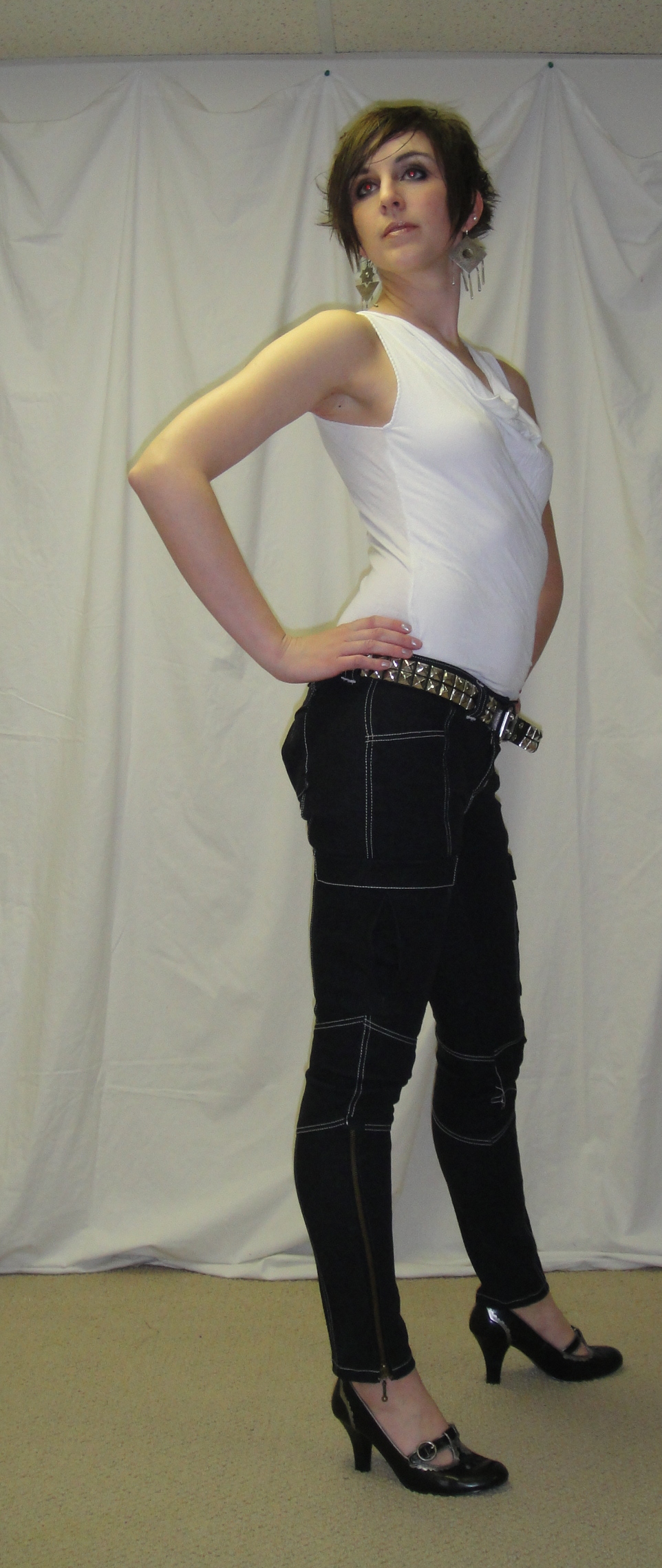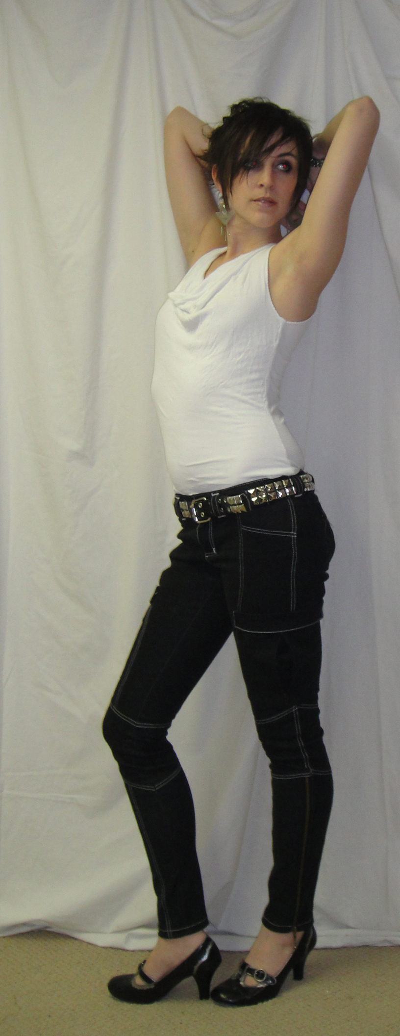 Styling these is… interesting. My first effort, with the white cowl-neck top and the heels, is fine but a little, ah, mainstream? Doesn’t really feel like me. Nothing some biker boots and a little goth gear won’t fix. Ah, yes. Much better.
