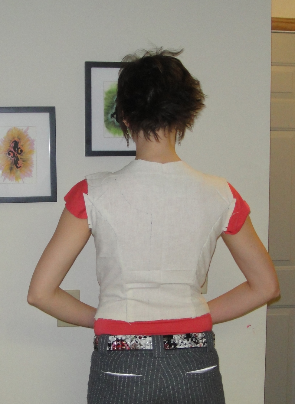 So, yeah, the pattern’s a mite small. I will throw up the initial muslin shots for your amusement. The top of the front is the only place where it closes. The rest varies from a wee bit too small to way too small (like 3″ too small at the waist).