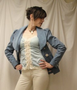 Great job on the jacket! The colour and fabric are wonderful, and I love how you styled it with the cream pants and the little blue cami!