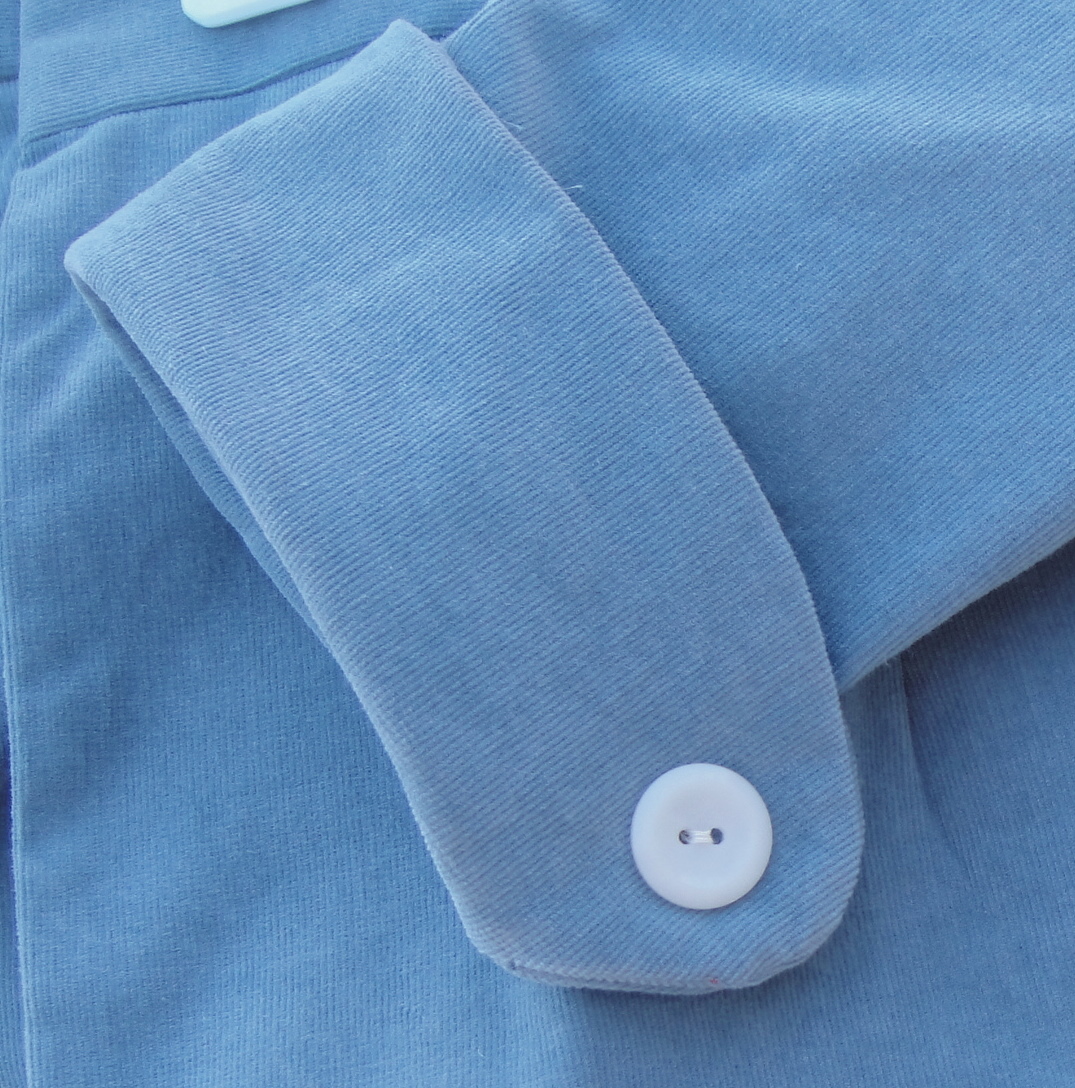 The collar went on fine. The cuffs drove me absolutely bonkers. Seriously, I had them on, off, on, off, on a different way… and they’re still not perfect. I’m not sure if they were drafted too narrow or if it’s just my sleeve stretching out with handling, or an artefact of the flared shape of the cuffs, but they were too short for the wrist-diametre of the sleeves. So I narrowed the sleeves rather than re-make the cuffs. In the end they’re all right, although at least one of them has the side that I meant to be inside on the outside. Having ripped it three times at that point, I left it. I didn’t do any turn-of-cloth alterations this time around and I really should have. Mea culpa. I have such a hard time visualizing which side’s going to end up facing out when doing this kind of fold-back cuff. Maybe when I’ve done eight or ten more…