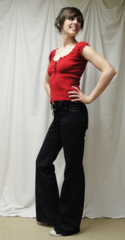 In about 1997, I stumbled upon two pairs of bell-bottom Wranglers, presumably vintage but more or less pristine, at a garage sale. They were a little big, but at least that meant they sat a bit low on my hips. In those days, stretch denim and low-rise pants had not yet penetrated to my little backwater… I was still wearing my Levi 501s and trying to figure out why anything that fit at the waist had huge flaps at the hips. At seventeen you don’t really have a clear sense of your body… all I knew was that the look I was seeing wasn’t quite right. I was also still wrestling with my 80s-bred distaste for any pants that flared at all. The wranglers hung off my hips at the perfect level, though, and if they didn’t hug or skim anything, well, as long as I could show off my tummy, at that point I didn’t much care. I wore them with boho shirts and a metal-link belt that had belonged to my mother in the 70s, if not the 60s. I didn’t realize it at the time, but I would be wearing bell-bottoms more-or-less exclusively for the next decade.