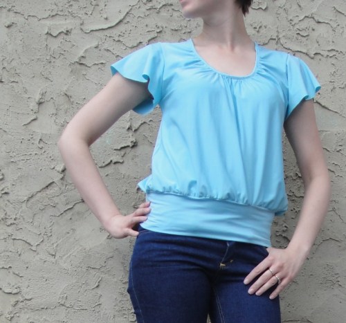 Anyway, one of my favourites has been a specimen with a wide hip-band, scooped, gathered neckline, flutter sleeves, and a keyhole opening in the upper back. And ever since I worked out my knit sloper over the course of last fall, I’ve been wanting to attempt to immitate it. How hard, after all, could it be?