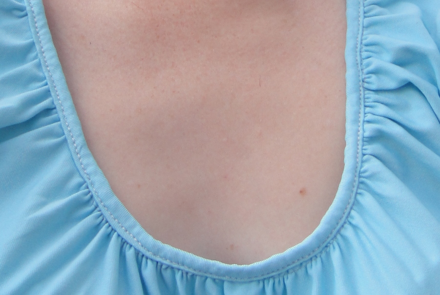 The hardest part of this entire project was binding the neckline. I have a really hard time producing nice bindings in thin, wriggly knits. I’ve sidestepped (or at least minimized) the issue in the past by using a lot of cowl-necked patterns or other alternative neck finishings for the thinner knits I’ve sewn up, but for this pattern I really needed to bind the gathered neckline. I achieved it, by dint of much fussing, cussing, and the flagrant application of both Steam-a-Seam and Wonder Tape, but it’s not especially pretty or professional-looking. Also keeping my gathering from squooshing under the machine foot was nearly impossible. It’s not perfectly even, but at this point I’m not going to complain. Sadly, I’m not sure I can do a lot better with the equipment at hand.