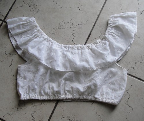 This is a “vintage” (my guess is 70s, it was kicking around in my dress-up clothes from the early 80s and I presume it wasn’t new then. Also it kinda screams 70s.) peasant-top that somehow I’ve never been able to pass on, although I doubt I’ve really worn it since I was fourteen or so. Maybe sixteen. Anyway, at some point in the last fifteen years the elastic has gone to that great sewing studio in the sky, or at least its springiness had, so the shirt has been kicking around in the mending for quite a while.