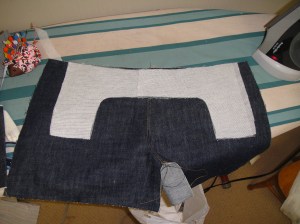Partly because I was really unhappy with the slit feature, and partly because I was trying to slug away at the piece and get it done before I had to reathread the machine for a kajllion kids’ projects, I sorta gave up trying hard. My topstitching around the inner part of the front fly panel isn’t symmetrical. I didn’t place my buttonholes properly, AT ALL (at least the topstitching I can fix if I come to my senses). My machine really doesn’t like zig-zagging with the top-stitching thread, so the buttonholes themselves are pretty dodgy as well (I tried buttonholer attachment, machine’s proper attachment, and manual—it just really doesn’t like to zig-zag with heavy thread). I added patch pockets to the rear, mostly on the principle that my butt needs as much decoration as it can get. Those are actually all right, although I forgot to do any topstitching designs before I sewed them on, so they look a little plain.