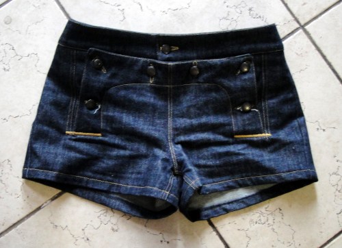 I like the sailor style opening with all those buttons. The placket would be easier to sew if there was a front seam, which wouldn’t be too noticeable in shorts that short!