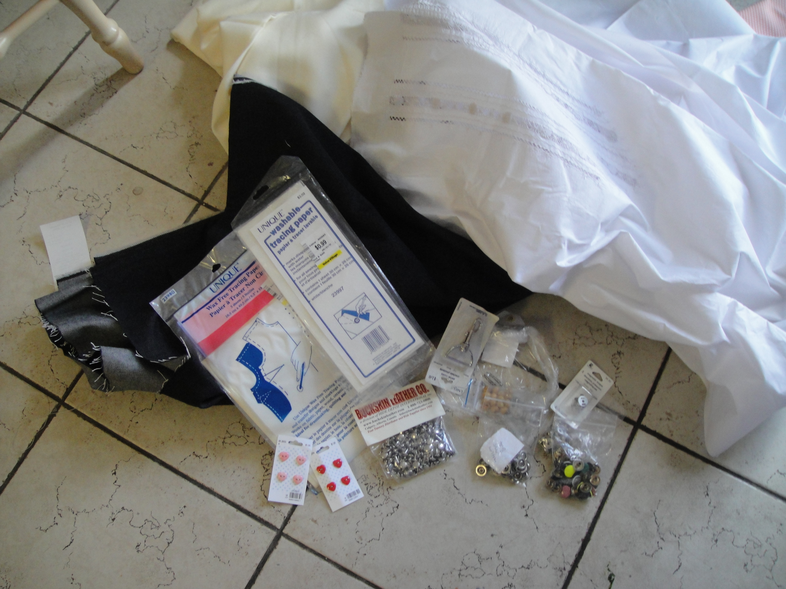 Apparently after my last visit (when there was no fabric worth mentioning) they busted out the good stuff. I walked out with 3m of sturdy black non-stretch denim (I may have to break down and make my hubby a pair), a similar amount of something that feels like a very lightweight wool, and about a kajillion metres of white starched cotton with this interesting bit of lacework (that only barely shows in the photo) on the one end. That may in fact be hand-worked lace, although I don’t know enough about such things to be sure. And some nifty notions, including tracing paper and a bunch of heavy-duty snaps and rivets.
