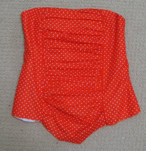 So of course, instead of working on them I started on my red polkadot sundress. It’s based very, very loosely on the Katjusha pattern off Burdastyle. Although the shirred back piece theoretically makes fitting a snap, I did not find this to be the case. Although I’m pretty much a Burda size 36 (or possibly 18 with monkey-arms and giraffe legs), I am not exactly the typical shape. A quick muslin of the front pieces showed that I needed to reduce the bust curve substantially. Fortunately I’d omitted the darts in the side-front pieces (I’m not sure why it has both darts and princess-seams, but happily leaving the darts out meant that the waist was actually large enough). I also reduced the arching of the top of the front. I should’ve omitted it entirely; although I like this feature in theory, as you can see in my inspiration sketch below, I always find the shape or proportions are off, at least for my figure, when I try it in practice. I lengthened the bodice below the waist, too, so that the skirt will begin down on the hip. Then , having achieved something approximating fit, I (rather unscientifically) doubled the length of the centre front panel so that it could be gathered to form a ruched front. Because Amber got me thinking about them with her swimsuit post and, well, despite the fact that more bulk through the midriff is the last thing I need, I like the look. More importantly, I like the look on my actual body, not just on my theoretical bombshell body.