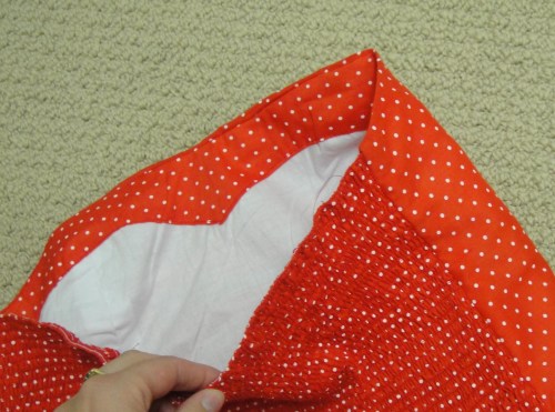Then I shirred the back, which is a simple double-thickness rectangle. This takes forever, but is pleasantly mindless while listening to a good podcast. It took about three bobbins full of elastic thread, and seems to have majorly thrown off my bobbin tension (oops!), but other than that worked quite well. I’ve never had a problem shirring on my Janome. Although it does some odd things to the polkadots!