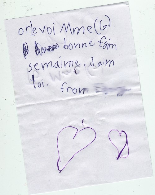 What Tyo meant to write above was “Au revoir, Mme G. Bonne fin de semaine. Je t’aime.” (“Good bye Mrs. G. Have a good weekend! I love you.”) What she actually wrote would translate, to the extent that you can translate words this mangled, as “Gurdlebee Mrs. G. Good hungry week. I you love.” How did I listen to her speaking all year and not realize she was putting an “L” in “au revoir”? (Hopefully you won’t judge the French Immersion teaching quality too badly by my children’s ability. My family seems to specialize in late-blooming, academically. I went from nearly flunking Gr. 3 to having an off-the scale reading level by Gr. 6.)