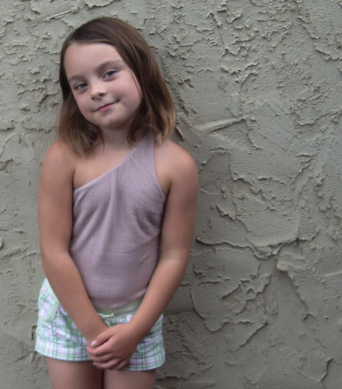 Ok, so let’s start with the McCall’s pattern. This is another of those “Sassy Girl” brand of patterns, illustrated to pique the imagination of any little girl. I used another of these for Syo’s vest. They’re adequate patterns, I guess, but I find them really simplistic, to the point where I suspect the final result is likely to be compromised. I haven’t read the instructions, so I can’t really comment on them. For a simple knit top like this, though, I guess there’s not going to be much to the pattern in any case. The smallest size in my envelope was a 7, which is borderline too big for Syo; given what I know about this fabric—it GROWS—I figured we would need to narrow it a fair bit.