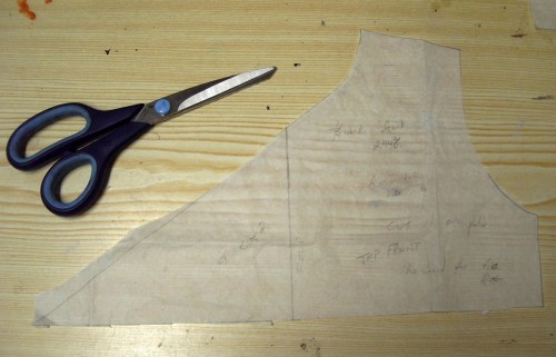 This fabric is left over from one of the cowl-neck iterations. It’s got a lovely, soft drape, an interesting knit stripe, is wriggly as hell to cut out (we pinned it to the carpet), tends to grow like crazy when handled, and a dull colour that just irks me. It looks like the colour the block of white paint turns when everyone’s been mashing other colours into it. Hmm, I may have been spending too much time entertaining small children lately…