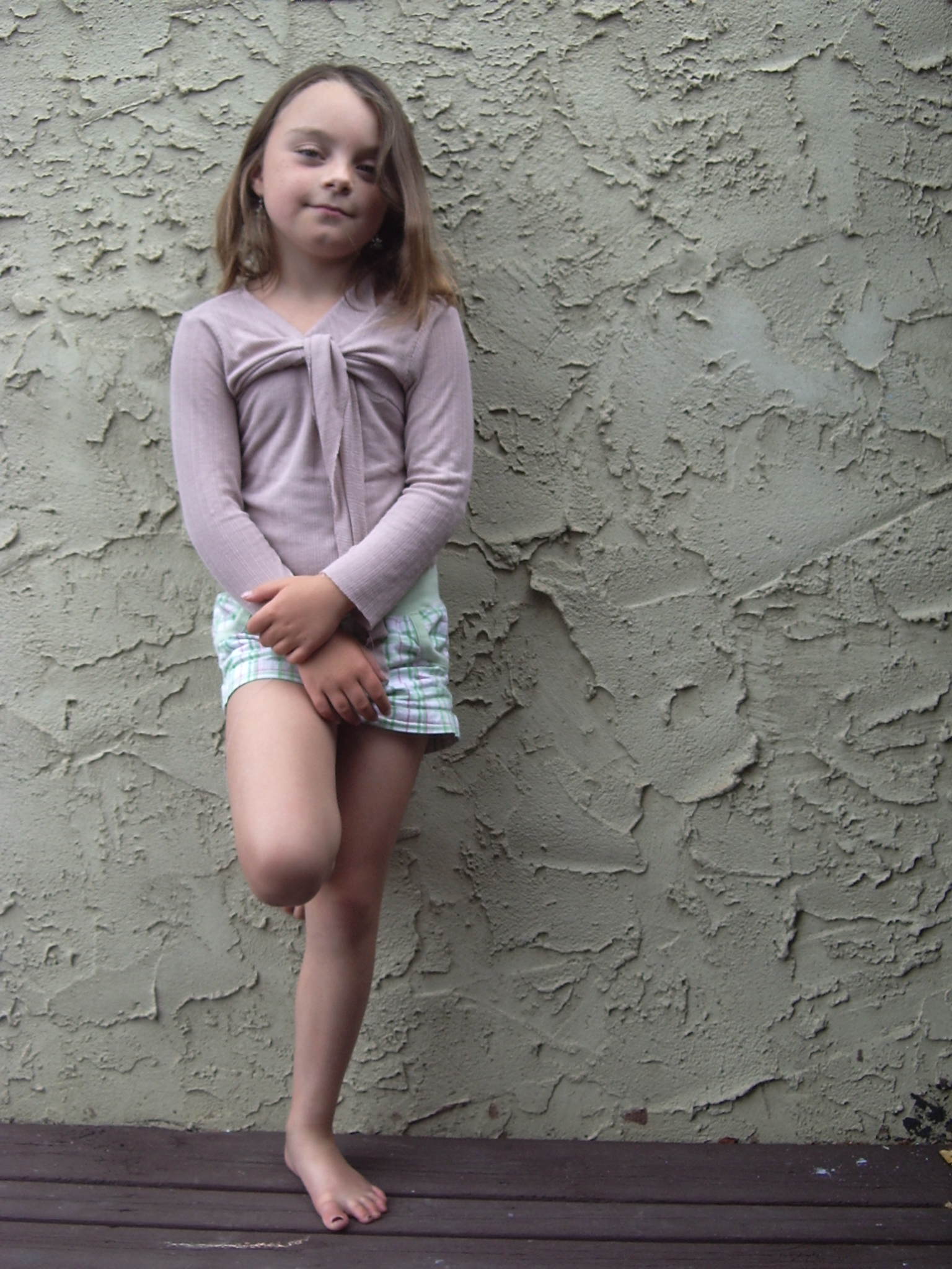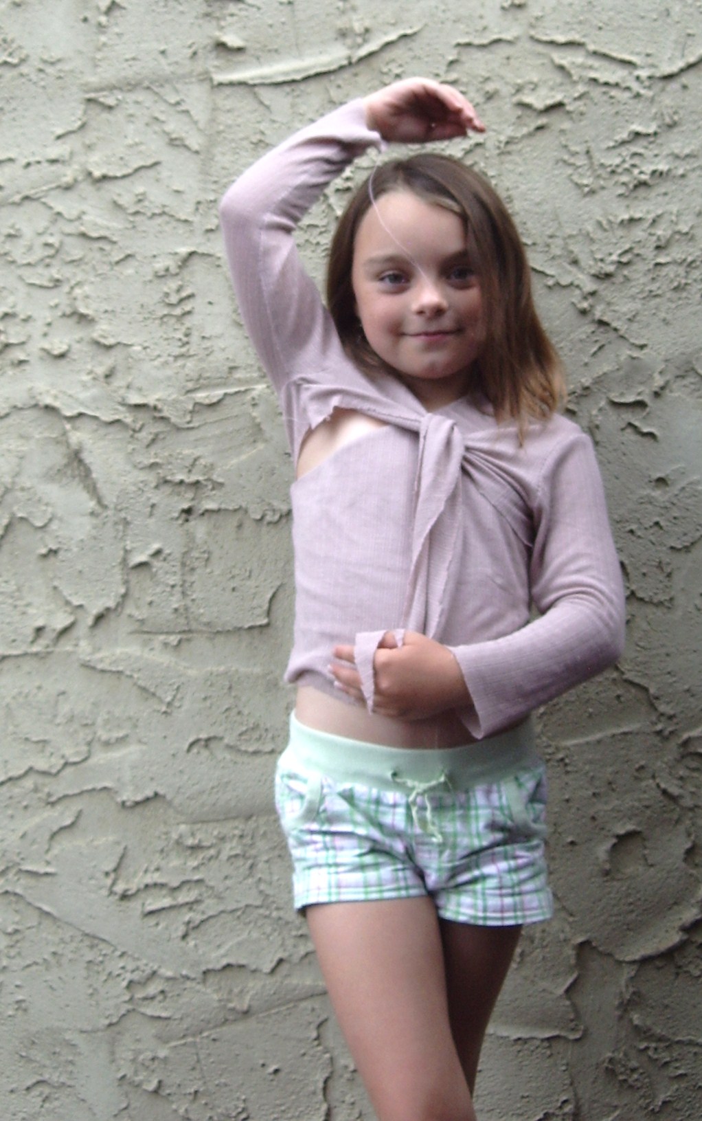 The little tie-sweater is based on Kwik Sew 2448. What, you don’t see the resemblance? Use your imagination! Actually, I traced off the pattern pieces for the long-sleeved version of the top, which is an utterly ordinary knit tee pattern. I cropped it short at the “lengthen and shorten here” line, which wound up being a bit short (but again that might just be the fabric), and turned the cut-on-fold of the front into an extended tie.