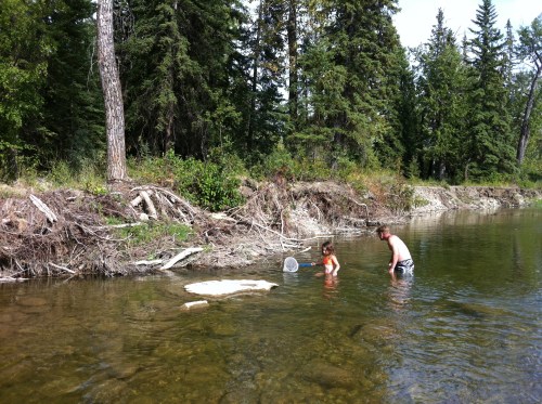 Well, I didn’t actually think this dress would make it to a three-part series, but sewing’s been slow. Largely because summer has been having a last gasp, so instead of sewing I’ve been out wading in the creek, dutifully snapping photos while my hubby and Syo (Tyo’s gone camping with a friend) hunt minnows with their nets. They are getting disturbingly good at it. Today we saw two guys fly-fishing, which is incredibly elegant to watch. They weren’t catching anything bigger than we were with nets, though. (Mind you, they were staying dry… not sure if that’s a bonus or not, though, given the heat. I was very happy to have my feet in the water most of the time.) We stumbled upon a geocache, as well, or rather, a geocache box that appeared to have been swept downstream and spilled all over. The creek is odd, a Provincial Park in the middle of the city, the illusion of unspoilt nature—a sliver of mountain stream—with freeways arching overhead and houses only a stone’s throw away, just barely hidden by the banks. And, of course, plenty of trash. And bones, mostly bovine. I can’t resist picking those up and seeing what I can still identify.