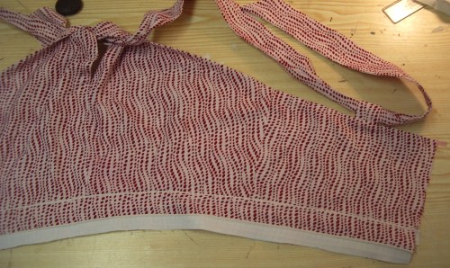 So—I got the bodice constructed. I decided to stay the edges of the top by stitching some random pink seam binding down. Syo was helping, so I let her do one side, since I figured the stitching wouldn’t show anyway.