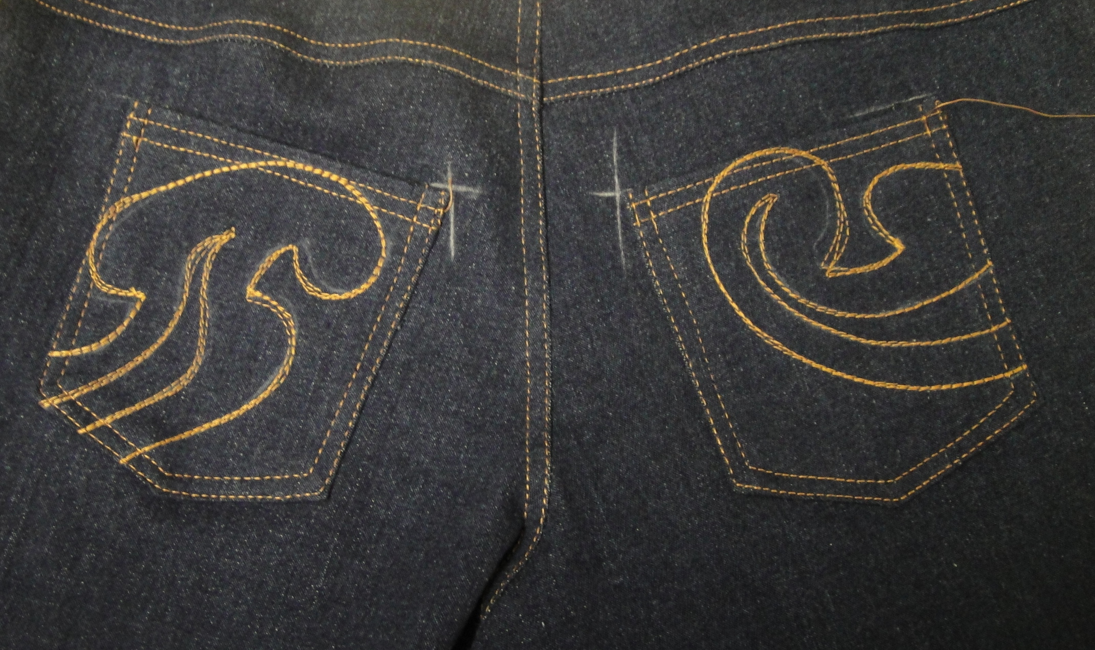 I like my pockets smallish on the theory that they make my butt look bigger by comparison. I also like them highlydecorated; according to the fashion magazines I don’t read, this is also better for those of us who are under-endowed in the derriere department. They could probably be a bit bigger than this, though, and still look fine. Thoughts for the future.