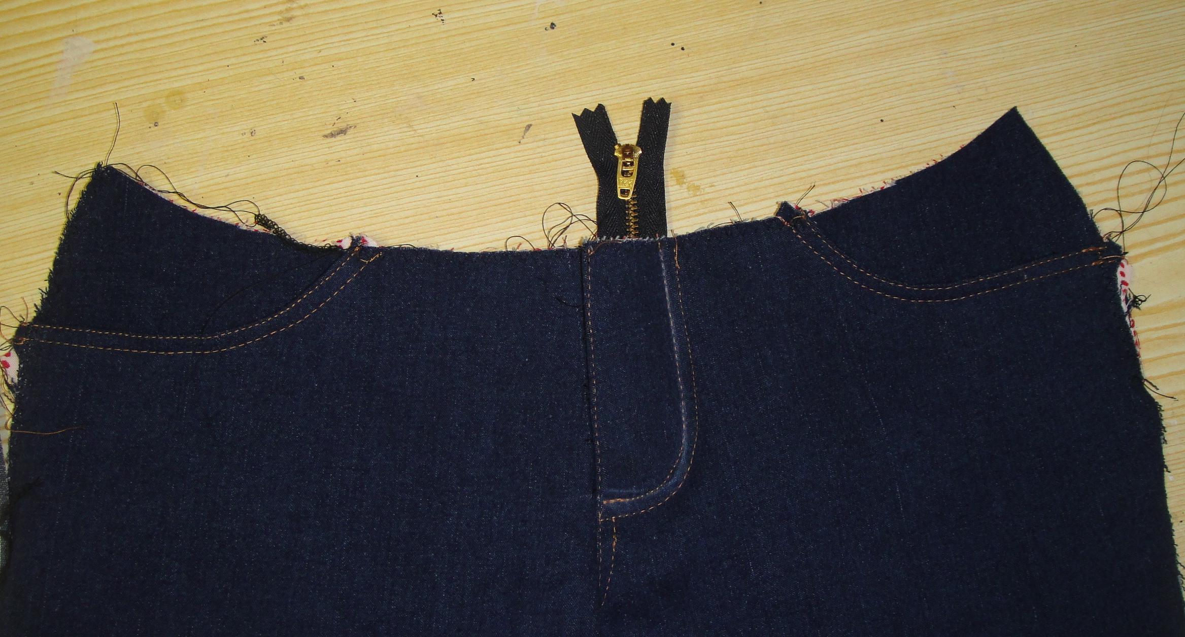 A lot of people recommend using a somewhat longer zipper so you can stitch on the fly without worrying about stitching around the pull. I like this because I hate stitching around the pull (I am not a zipper queen), but also because the shortest jeans zippers I can find are about 8 cm long and as you can see from the top photo, in the rise I use the zipper opening is about 6 cm long, tops.