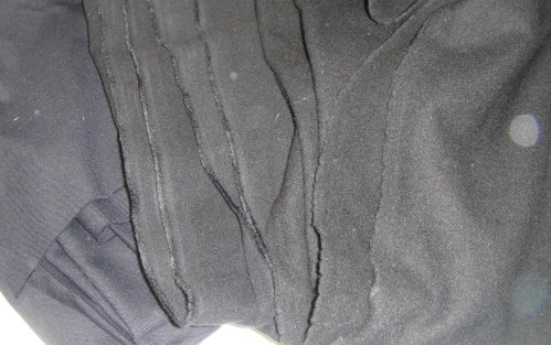 I wasn’t sure I would have enough (there were only 2m from the thrift-store find) so when Fabricland had a good sale, I picked up two more metres of Β black “Kashmir Jacketing” (which, as far as I can tell, has absolutely no cashmere in it, but anyway). I was pretty sure this was the same fabric as the thrift-store find.