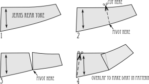 I made a couple of fit adjustments, although it’s not entirely clear how successful they were (I’ll get back to you once the waistband’s on). I curved in the yoke by a couple of cm (standard on Jalie 2908 unless you have a really flat butt, I think), and I increased the rear crotch length (height? depth?) by adding a wedge 1 cm wide at the CB seam, tapering to nothing at the side-seam. In theory, this gives Tyo a bit more (much needed) booty coverage.