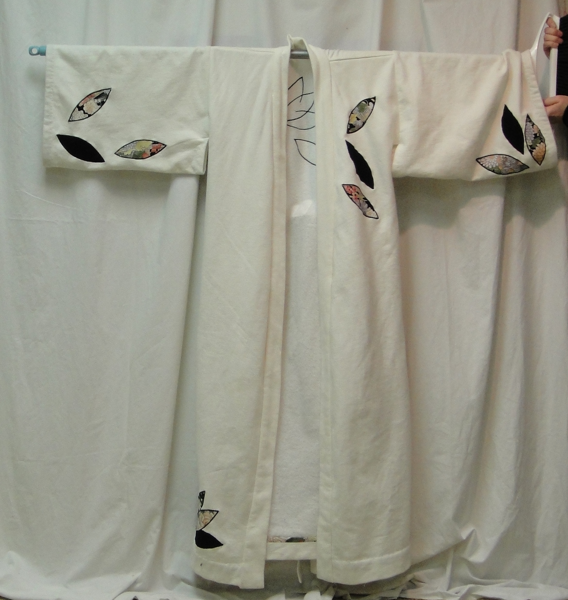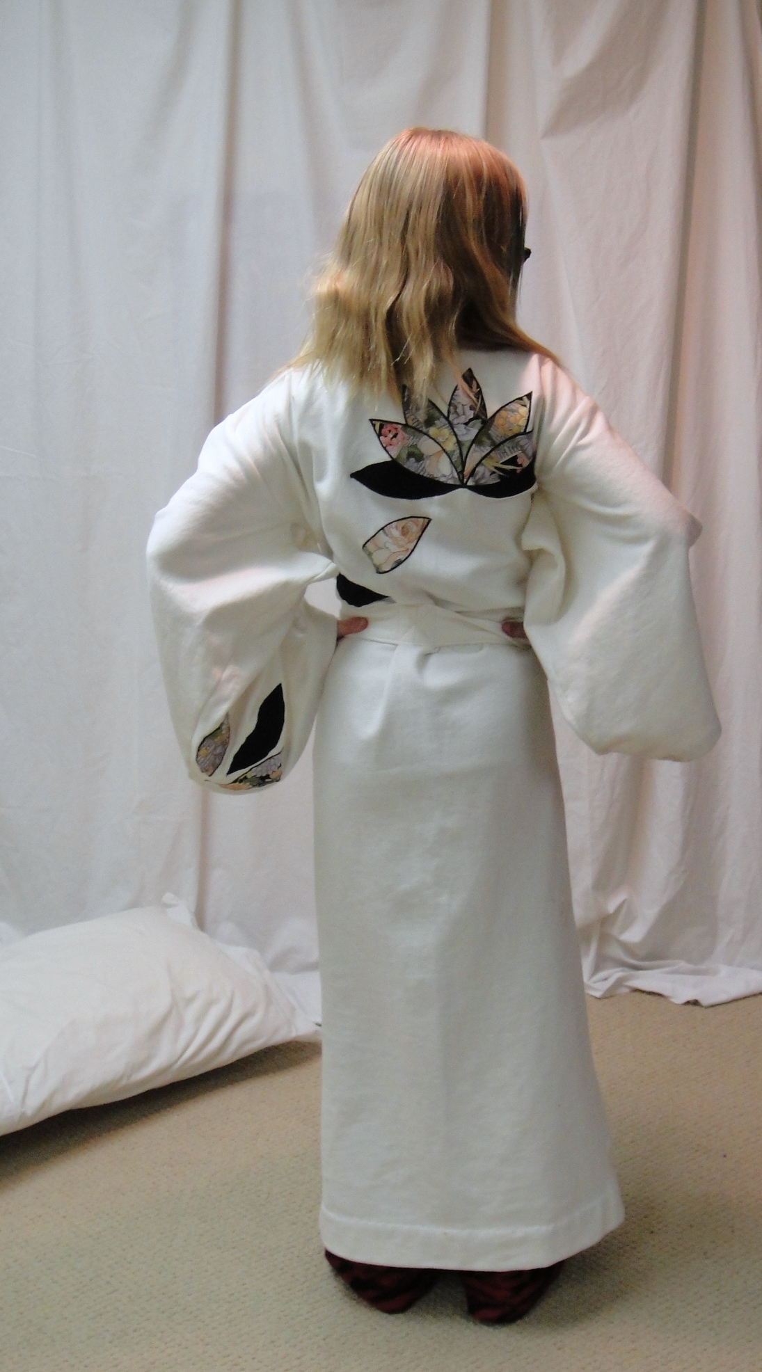 J just got back from a trip to China (not Japan, I know) and he brought me back a silk kimono robe. I have that same issue with the rectangular body part of the robe not staying closed around my hips. But it’s still really pretty. I LOVE the length of this robe. I can see why she’s wearing it all the time. Looks so cozy but still funky. And I’m so impressed with your applique.