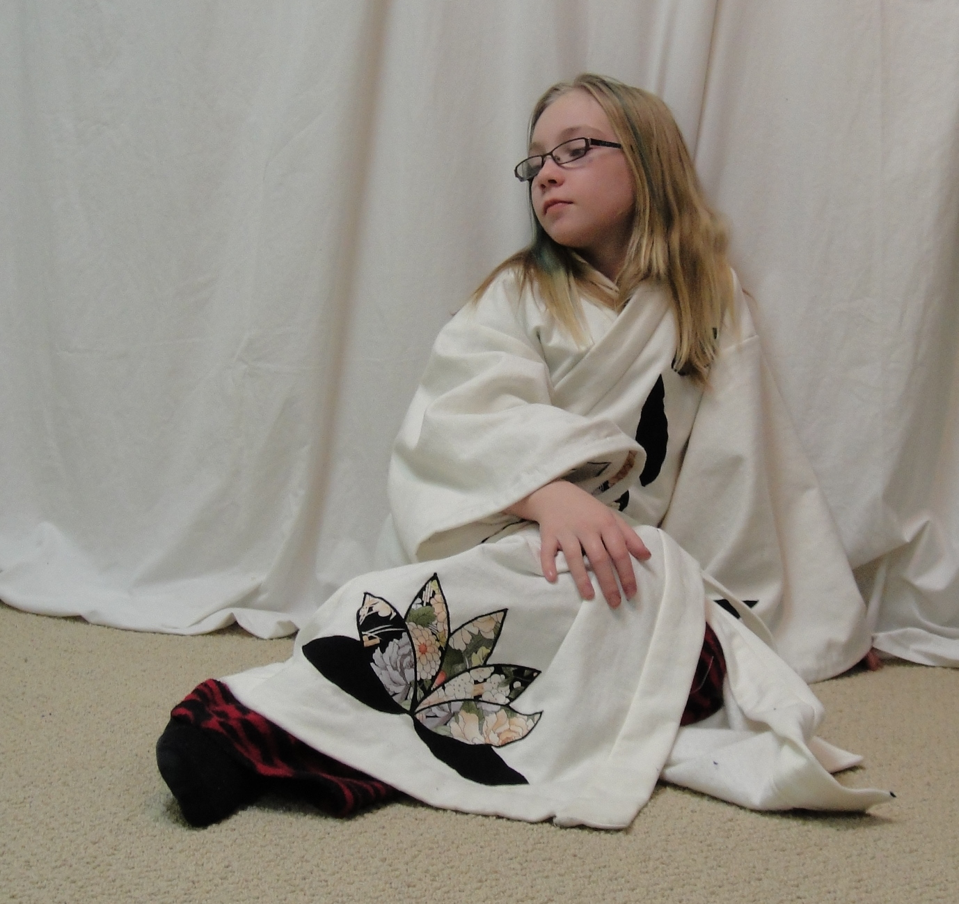 Tyo’s robe is finished and has been worn pretty much every day, so I’d say it’s a success. Although now she wants those loop-over-the-arms tie things that keep the kimono sleeves from dragging in everything, because, well, they drag in everything. Fortunately we’ve watched enough Miyazaki that she knows all about them.