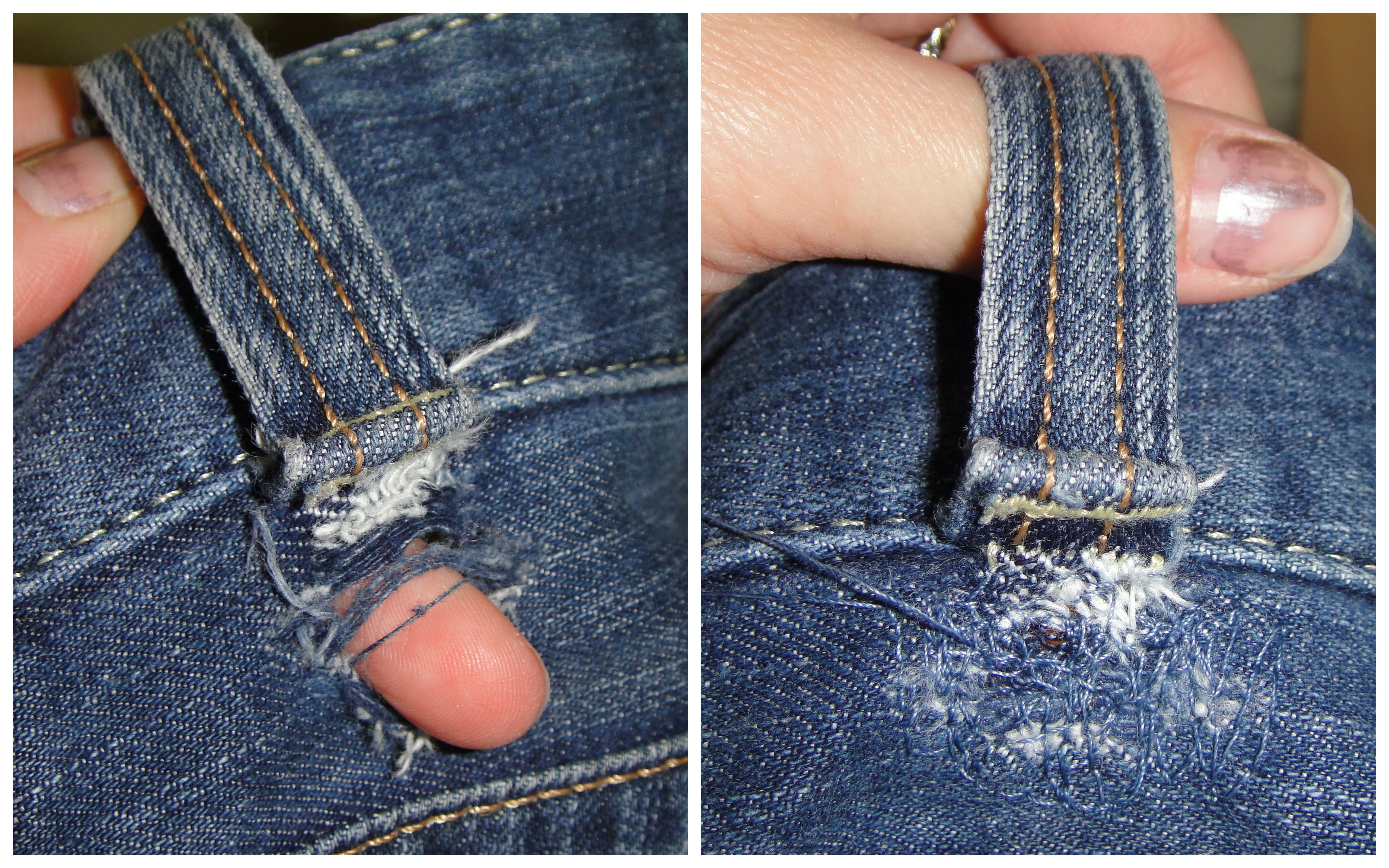 These skinny jeans are two years old, originally from Guess. The left knee is gone (typical) but a little more troublesome was the state of the rear yoke just below the belt-loops. This is a high-stress area, and holes had pulled where the bottom of the belt-loop attached.
