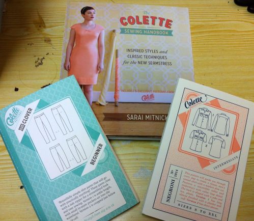 The Colette Sewing Handbook, the Negroni men’s shirt pattern, and the Clover pants.