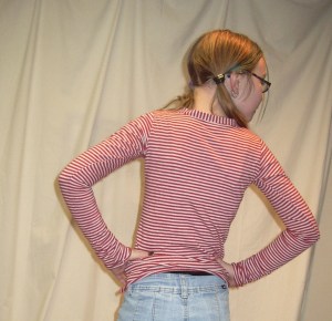 As I procrastinated my way through last weekend (as is my wont), I asked Tyo if she’d like a shirt from the remaining bits of my red and grey striped fabric. As I already have two shirts out of it, I thought a third might be overkill. Tyo was amenable, so I cut out another version of her fitted knit top.