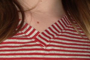 I did an unusually good job of measuring the neckline for the neck-band (on my usual scooped necks I just sort of cut an approximate neckband and stretch as I go, but you have to put V-necks on in the round, as far as I can tell, so a little precision goes a long way. I also did one small but obvious thing, I made a tiny snip in the point of the V (before I started attaching the neckband) so that the seam-allowance can fold back. And, miraculously, I ended up with my first-ever, completely-non-puckered V-neck finish! Who knew? (Yes, I know, everyone who ever bothered to read up on inserting V-neck bands knew. We’ve gone over the stubborn-have-to-make-mistakes-for-myself part, haven’t we?)