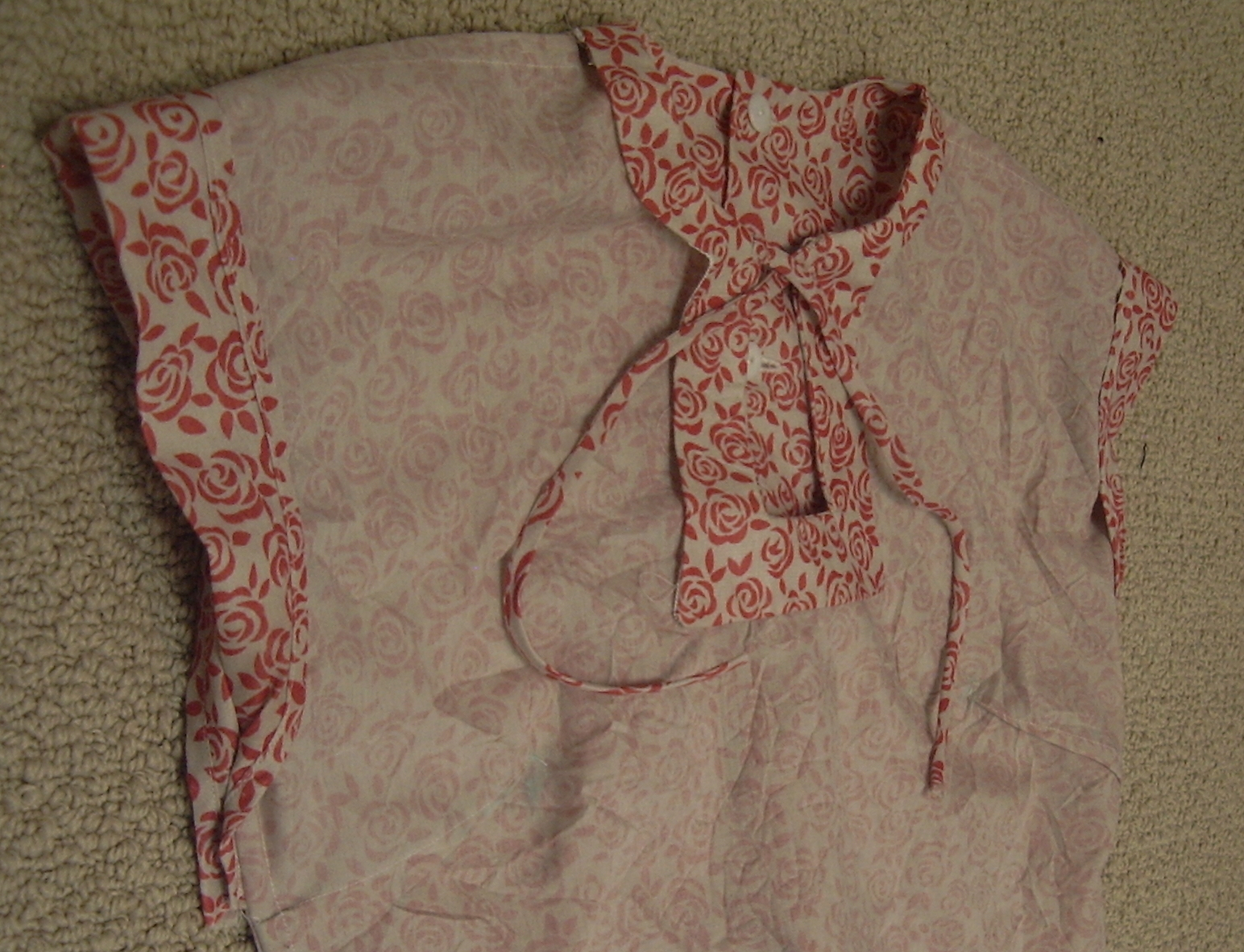 So, without benefit of instructions, I set to the next morning, starting with stitching the shoulders (french seam) and then the neck facings into place. I even remembered to stitch the ties in place! Of course, no sooner did I have everything nicely understitched, but I flipped it around and discovered a) my neck-facing was showing on the outside of my back button placket rather than being sandwiched between the two folded layers (leaving an unsightly raw and flapping edge) and b) the neck was WAY too tight.