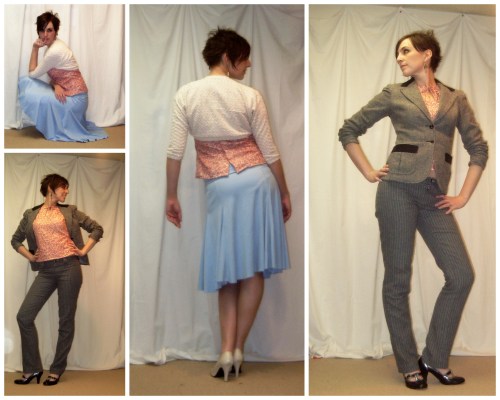 I really wasn’t sold when I first tried it on, but after throwing it together with over half my wardrobe in a shotgun approach to styling, I think it’s growing on me. I really like it with the shrug, I think because I like the brighter colour contrast near my face. The mix of colours in the blouse kinda blends into my skin tone from a distance. I also think it might be great in a more drapy fabric—crepe or rayon or (ulp) silk. For most of my wardrobe needs it’s also a bit short. You’ll notice one way you don’t see it styled here—tucked in. I tried, honestly—with my circle skirts and my Kasia skirt. It almost worked with the Kasia, but the colours are wrong. And, well. Blouses. I have Blouse Issues.