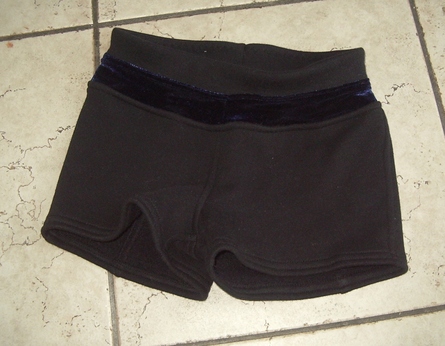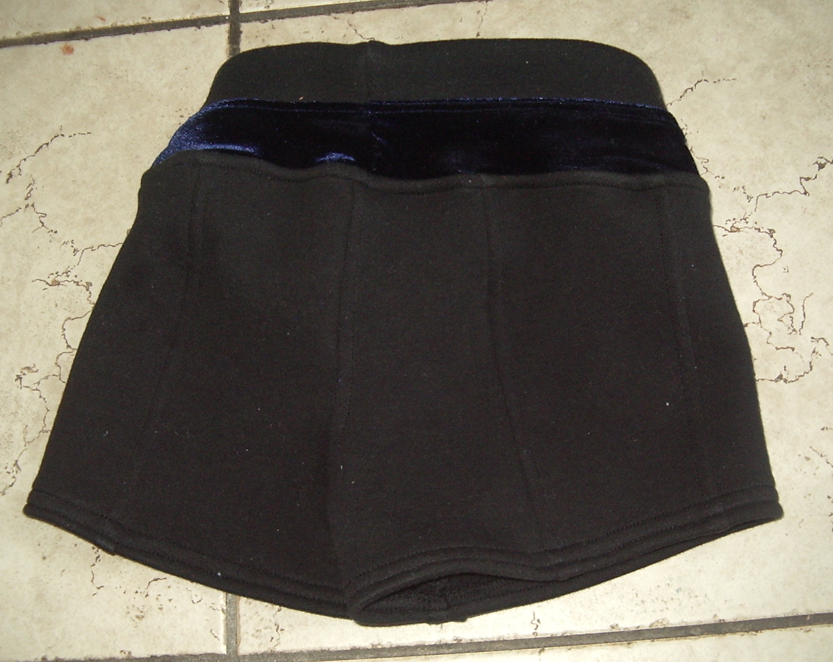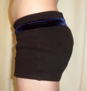 For construction I followed the Jalie instructions much more closely this time, especially for the waistband, which is the full height with the decorative “contrast” band—in this case it’s made of blue stretch velvet, from a tiny remnant I had to piece at the CF (in hindsight, it would’ve made much more sense to put the seams at the sides, but I wasn’t thinking far enough ahead.)
