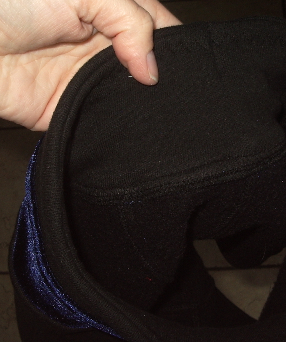 Having finished cutting the last bits for Tyo’s bunnyhug last night, I had about half a men’s XL sweatshirt left sitting on the basement floor, so I decided to cut the shorties (Jalie 3022) for Tyo out of it. It may be borderline in terms of stretch, but then so was the red striped fabric I used for Syo’s pair. I tend to round up the Jalie patterns for the kids, because I’d rather make their clothes a little loose and have them grow into them. (This does not always thrill my children.) On the other hand, I really need to re-measure them; Tyo grew something like two inches since Christmas.